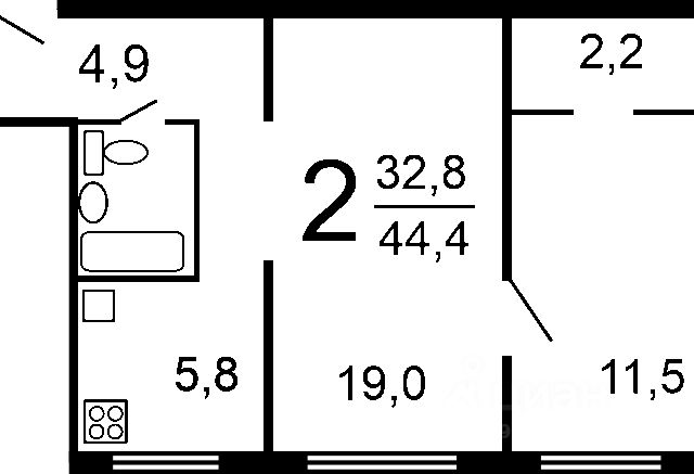 Просторная кухня 10.2 м2 и 2 изолированных спальни 10.8 м2 и 16.4 м2, с/у совмещенный, в коридоре есть дополнительное помещение, которую можно использовать, как постирочную, кладовую - 2.4 м2