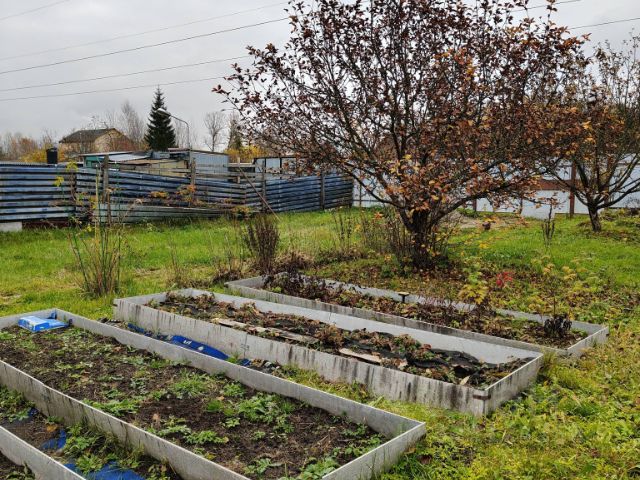 Участок приподнят, огорожен, на участке размещены дом, летняя кухня, хозблок с туалетом и душем, мангал, плодовые деревья, сосны, кустарники и грядки. Есть место под две машины. Парник, к сожалению, зиму не пережил, промялся под снегом.