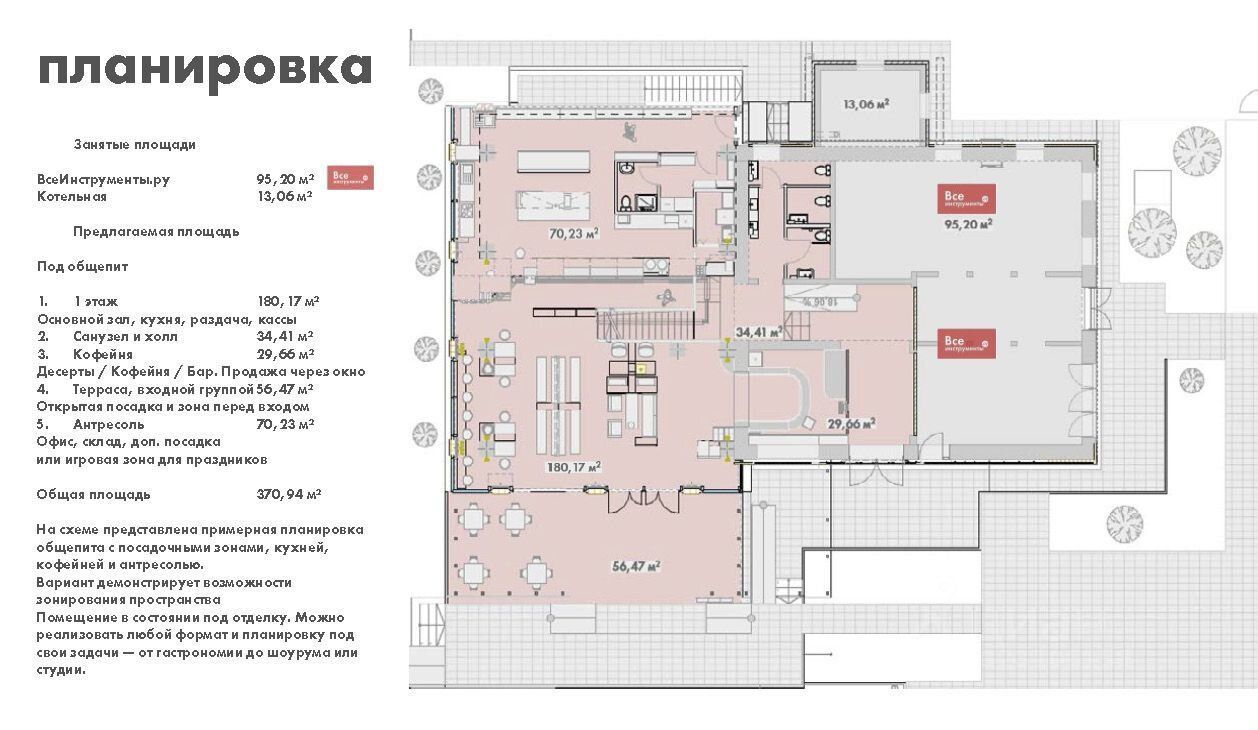 Зальная планировка, 3 входа, 240м2 - зал, 70 м2 - антресоль, террасы перед зданием 70м2. Возможно увеличение площади на 140м2 цокольный этаж. Электричество до 200кВт.