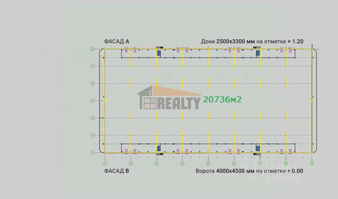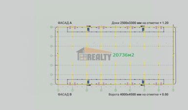 Основные характеристики: Высота потолка до низа ферм: 12 м . Размер склада по полу: 144х144 м. = 20736 кв.м. Шаг колонн: 12х18 м.