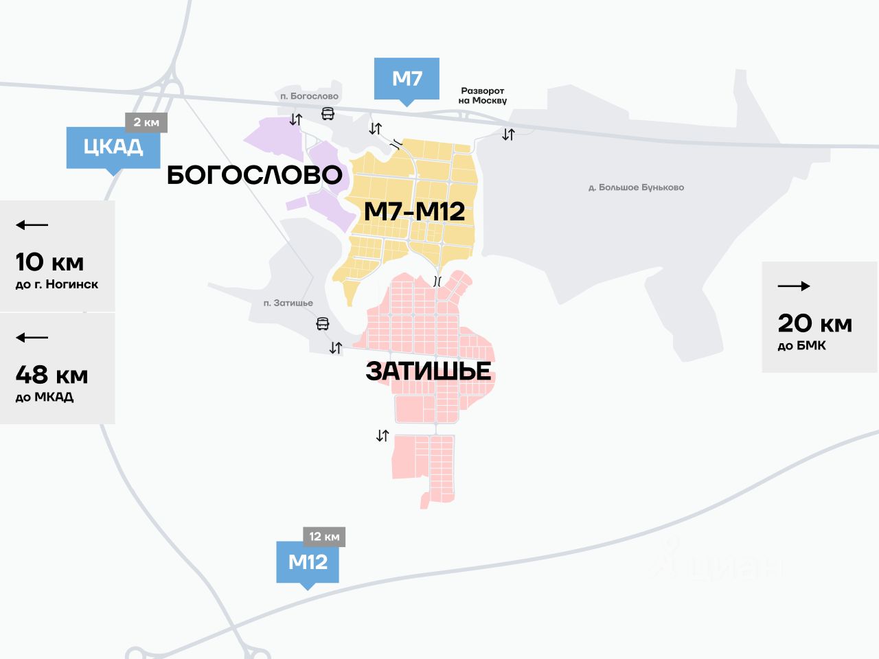 ЦКАД — 2 км, М12 — 7 км, БКЛ — 20 км, МКАД — 48 км