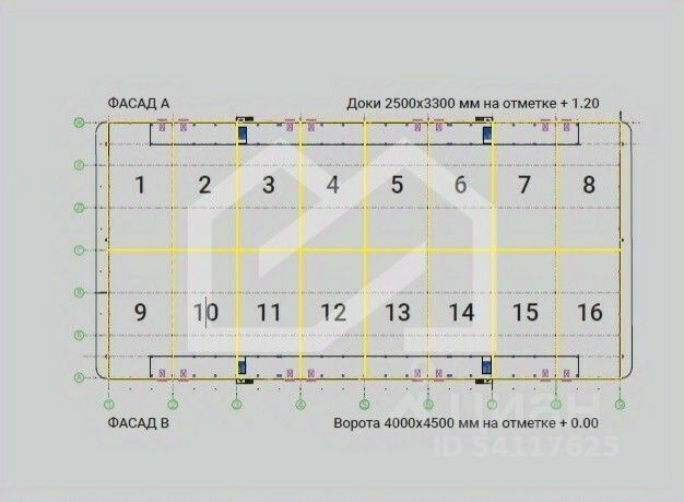 Ворота: 4 шт. доковых ворот Alutech на отметке 1.2 м и 4 шт. подъемно-секционных ворот на уровне 0 м.