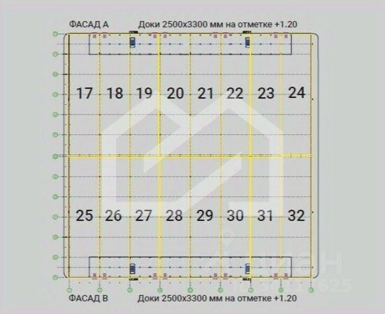 площадь склада: 20 736 кв. м., площадь мезонина: 2 880 кв. м.