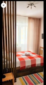 Большая кровать с удобным высоким ортопедическим матрасом средней жёсткости,шкаф, многофункциональная кухня ( микроволновая печь, электрический чайник, плита, холодильник, необходимая посуда для сервировки и приготовления).