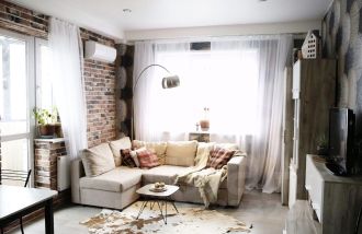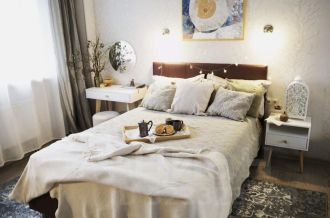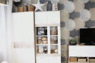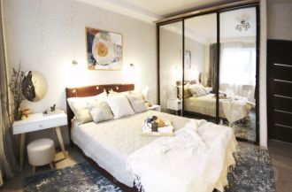 два кондиционера, два телевизора, стиральная и посудомоечная машина, плита и варочная поверхность, вытяжка, микроволновка, чайник, сушилка для белья, средства для уборки. Столовая посуда, постельное белье, гладильная доска и утюг, полотенца по запросу (за небольшую доплату к аренде). Из мебели есть все необходимое: два огромных встроенных шкафа, кухонный и письменный стол, кровать с системой хранения, раскладывающийся диван, система хранения для гостиной, стулья, табурет, прикроватные тумбочки.
