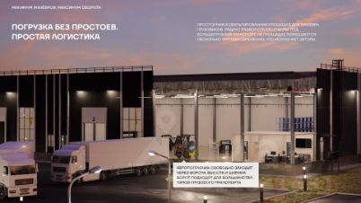 Погрузка-разгрузка: въезд под фуру, ворота 3,54,5 м, высота пола 1,2 м (доковый уровень), возможна адаптация под рампу