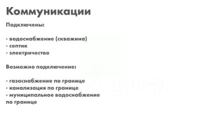 Магистральный газ, электричество по границе участка, возможность подключения к городскому водопроводу и канализации.