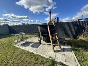 Качественно выведенные коммуникации, септик, скважина, в перспективе газ. Подъезд круглогодичный, соседи проживают постоянно. Участок огорожен, откатные ворота. Во дворе баня, уличная купель с подогревом на дровах.
