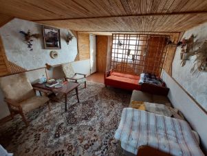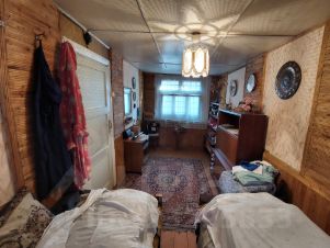 Уютный, каркасно-щитовой и утеплённый дом - на первом этаже находятся: веранда с удобной лестницей на второй этаж; две комнаты. На втором этаже: одна большая комната. Частично комнаты отделаны вагонкой, частично оклеено обоями. Фундамент ленточно-кирпичный. Крыша шифер.