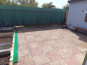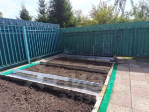 Участок ровный, сухой, с выездными воротами. Есть парковочные места на две машины. Дорожки вымощены плиткой.