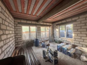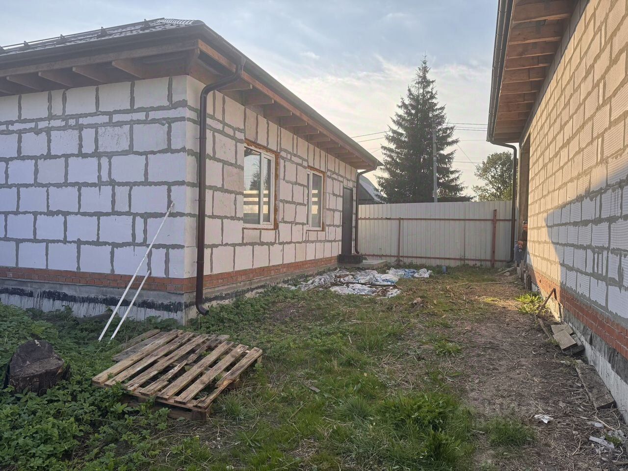 Дом из блока 40 см, на плите. Три жилые комнаты, санузел, кухня-гостиная, гардеробная, бойлерная. Потолки 3.2м. Строили для себя. Армопояс и перемычки залиты. Газ заведен в дом, есть котел Протерм-40, отделку можно начинать прямо сейчас. Центральное газоснабжение, канализация - выводы под установку септика. Вода - скважина, по улице идет водопровод. Участок земли 7.5 сотки ИЖС. Гараж ( из блока на плите ) 35 м2.