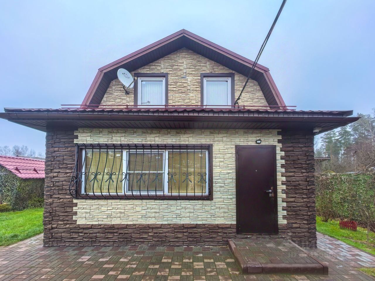 Каркасный. Снаружи обшит сайдингом с утеплителем Роквул (150 мм). Фундамент - ленточно-свайный (сваи по всему периметру и в середине фундамента). Крыша покрыта металлочерепицей с водостоками. Пластиковые окна (Рехау). На окнах кованые решетки с художественным орнаментом.