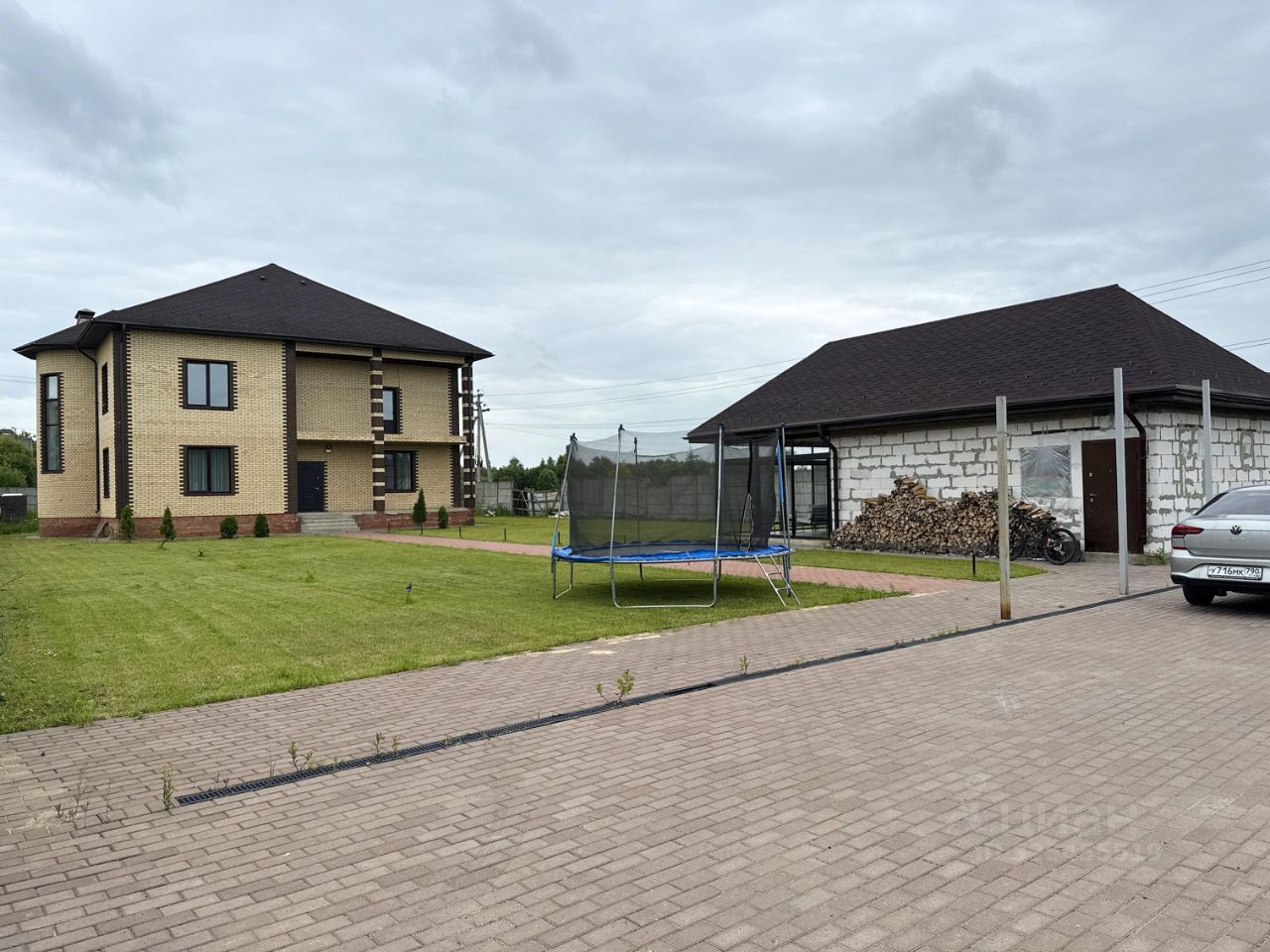 За пультовыми воротами большая площадка из брусчатки с вместительной гостевой парковкой, с частично подготовленными столбами для навеса и с дренажом. Готовы разводки для садового освещения и для автоматического полива газона. Перед домом просторная беседка с большими панорамными окнами, за которой удобно расположен хоз. блок.