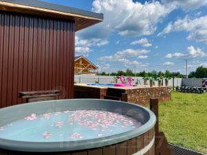 На участке площадью 11 соток находится бассейн , баня и купель (джакузи)и зона отдыха с мангалом. Также есть терраса с видом на живописный пейзаж. До ближайшей остановки общественного транспорта можно дойти пешком. Подключены центральное водоснабжение .септик. Газ проходит по границе участка. Земли СНТ.
