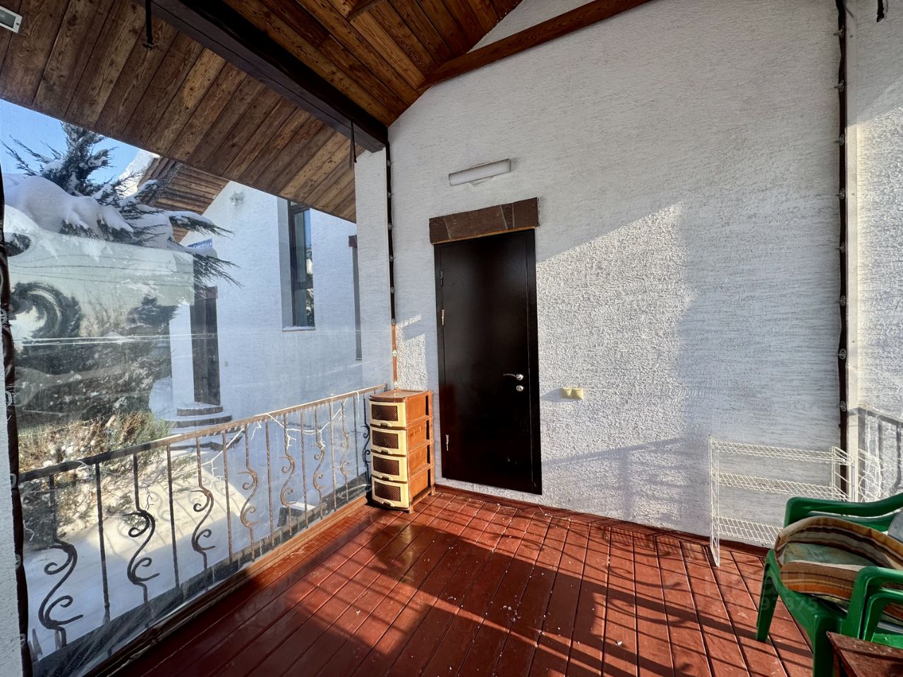 Два входа с двойными дверями обеспечивают хорошую тепло- и шумоизоляцию. Есть веранда с покрытием жидкое стекло.