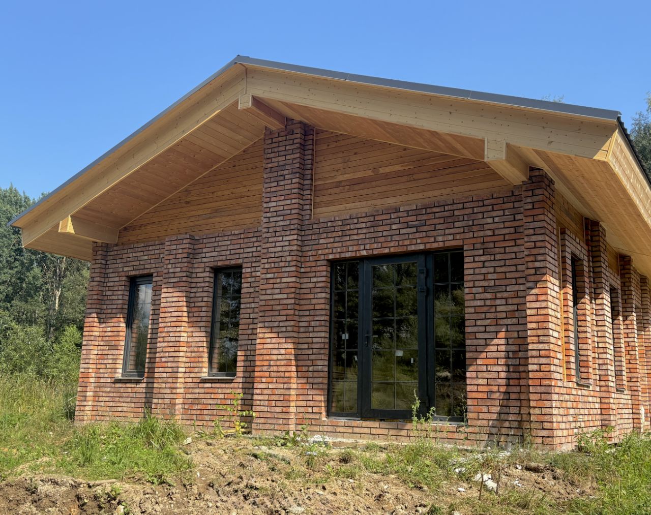 •Стены - газобетон Bonolit, утепленный по контуру и отделанный кирпичной кладкой из фасадного кирпича.