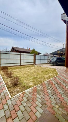 Парковка и дорожка под брусчаткой,залита бетоном. Вмещает четыре автомобиля.