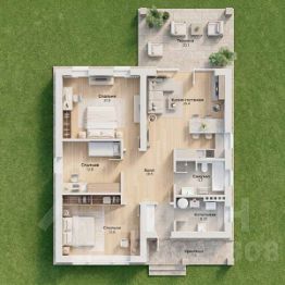 Планировка здесь ориентирована на комфорт в повседневной жизни: отдельные спальни обеспечивают приватность, а кухня-гостиная становится центром семейных встреч и общения.
