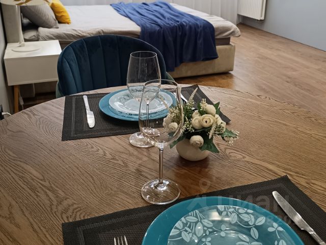 Большая кровать с удобным высоким ортопедическим матрасом средней жёсткости,шкаф, многофункциональная кухня ( микроволновая печь, электрический чайник, плита, холодильник, необходимая посуда для сервировки и приготовления).