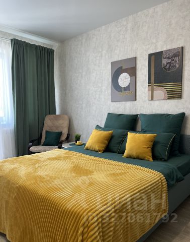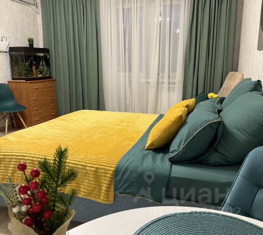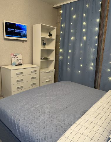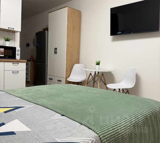 Большая кровать с удобным высоким ортопедическим матрасом средней жёсткости,шкаф, многофункциональная кухня ( микроволновая печь, электрический чайник, плита, холодильник, необходимая посуда для сервировки и приготовления).